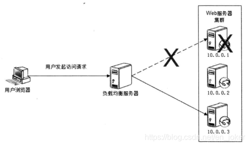 当Web服务器集群中服务器都可用时,负载均衡服务器会把用户发送的访问请求分发到任意一台服务器上进行处理,而当服务器10.0.0.1宕机时,负载均衡服务器通过心跳监测机制发现该服务器失去响应,就会把他从服务器列表中删除,而将请求发送到其他服务器上,这些服务器是完全一样的,请求在任何一台服务器中处理都不会影响最终的结果。