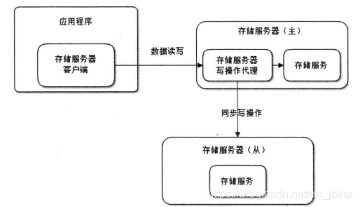 在异步写入方式下,存储服务器分为主存储服务器(Master)和从存储服务器(Slave),应用程序正常情况下只连接主存储服务器,数据写入时,由主存储服务器的写操作代理模块将数据写入本机存储系统后立即返回写操作成功响应,然后通过异步线程将写操作数据同步到从存储服务器。