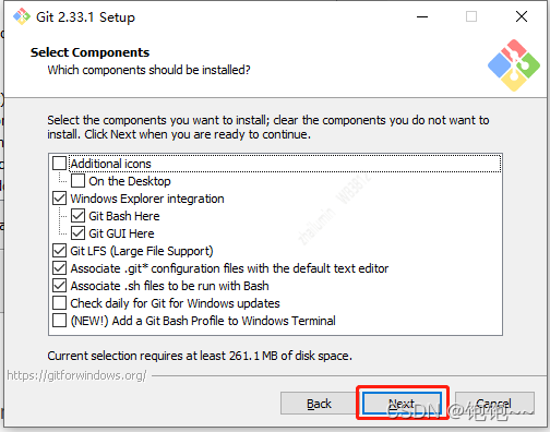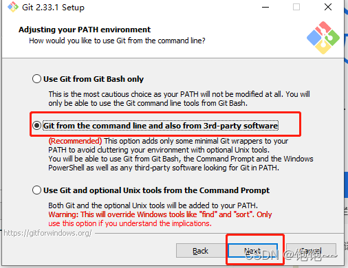 第四步:选择好安装路径后,点击 Next 进入下一步,弹出安装配置窗口,包括git命令行、git图形窗口等