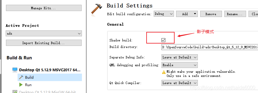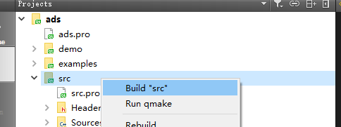 1. 首先用QtCreator打开最外面的ads.pro工程文件,我用的MSVS2017 64位进行编译的,右键build一下src项目。