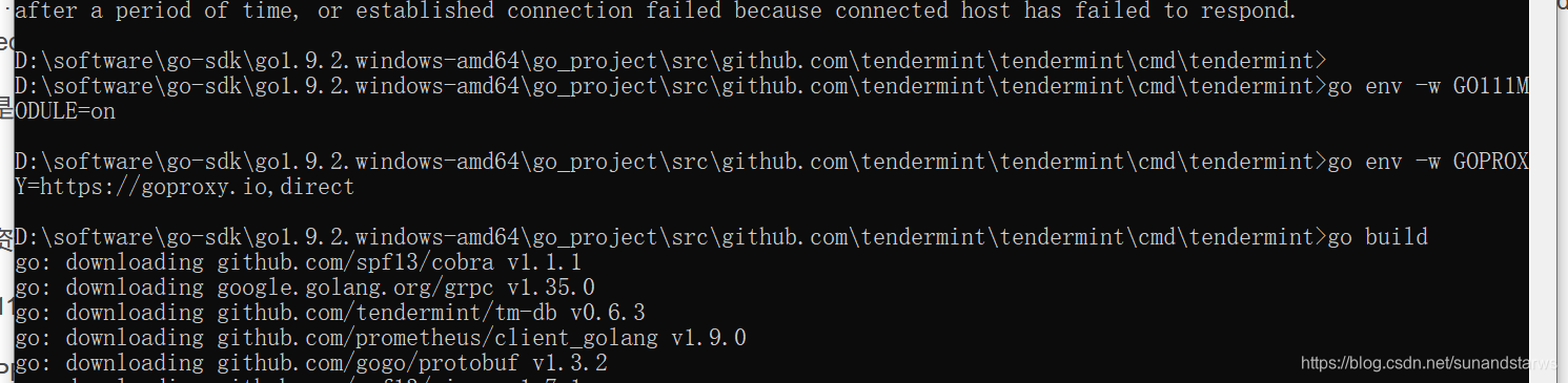 在用windows10搭建tendermint框架时报错“go: github.com/BurntSushi/toml@v0.3.1: Get "https://proxy.golang.org/github.com/%21burnt%21sushi/toml/@v/v0.3.1.mod": dial tcp 172.217.27.145:443: connectex: A connection attempt failed because the connected party did not properly respond after a period of time, or established connection failed because connected host has failed to respond.”
