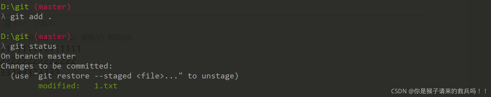 1、情况一:比如我在工作区修改了一个文件,并提交到了暂存区,提交了以后,现在我想撤回暂存区,但是我工作区的修改还想要