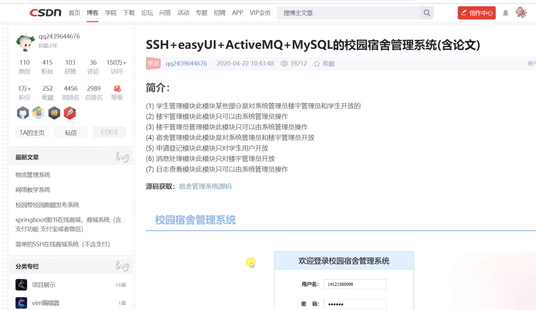 之前的毕业设计本着简单、不占用太多时间的原则,基于SSH和EasyUI做了宿舍管理系统,居然被评上了优秀,真的是走了狗屎运了。