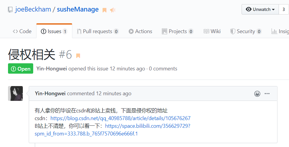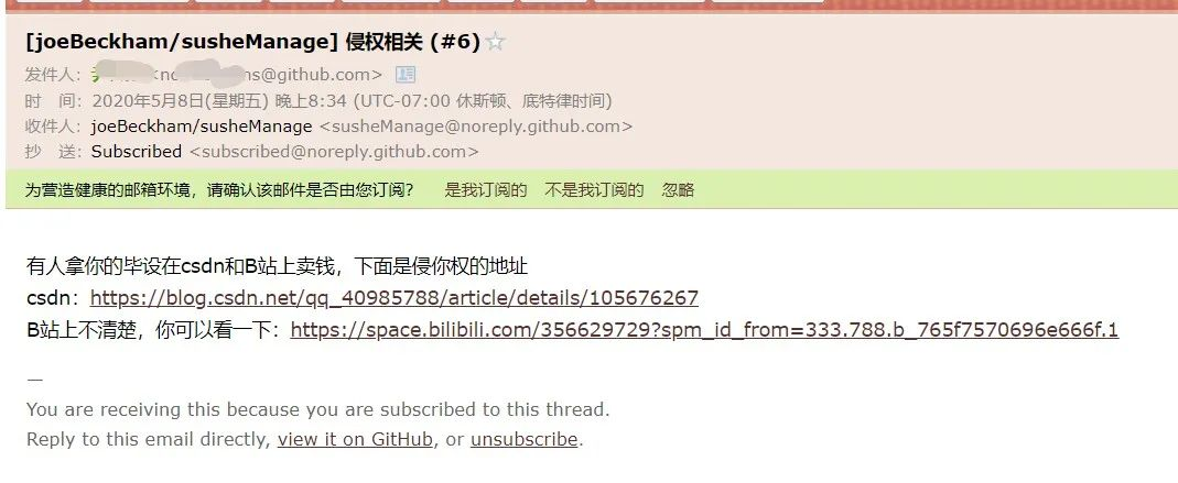 正常的周五,日常忙碌,突然收到一封【侵权】邮件,瑟瑟发抖。然而仔细一看,呵,竟然有人拿我几年前在GitHub上开源的毕业设计在CSDN和B站上卖钱,这有点太不可思议了。