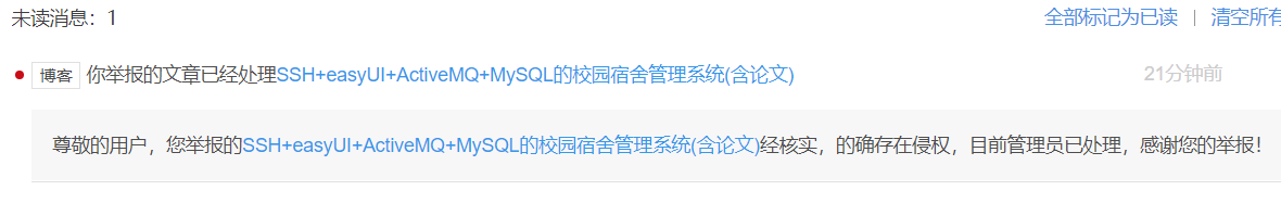 于是,我又在这篇文章这里举报了一下,CSDN的处理还挺快,后面我又刷新了他文章的界面,404了,看了下CSDN的系统通知:
