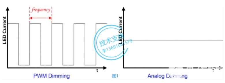 如图所示,采用DC模拟调光是对LED电流的每个周期进行调整。更简单地说,它是不断调整LED的电流大小。故而不会出现开关频率所产生的频闪和啸叫。