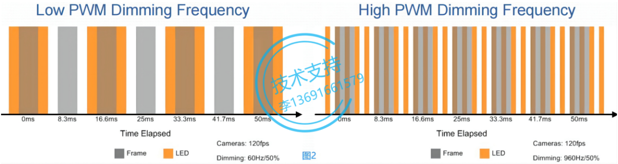 在PWM信号调光状态下,LED亮度会有”亮“、”暗”两个状态,不同PWM占空比下可以呈现出不同的亮度,当PWM信号的频率过低的时候会出现频闪问题。如图2所示:当PWM信号调光频率过慢的时候,如上图会出现摄影机在某些影格(Frame)里面是没有亮灯的情况,显示在影片画面上会出现所谓的频闪现象(Flicker)。当频率加快16倍如上右图的时候,每个影格(Frame)皆可抓取到正常亮度,最终显示在影片画面上就不会有频闪现像(Flicker)。