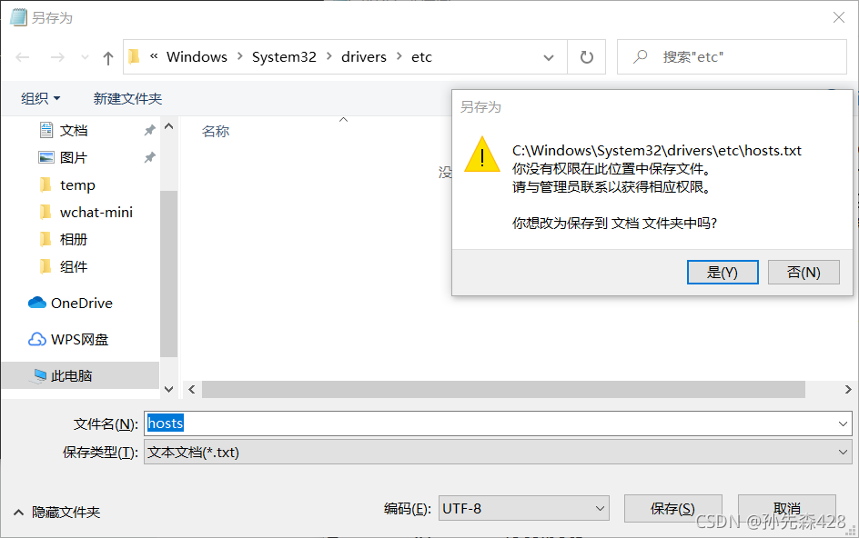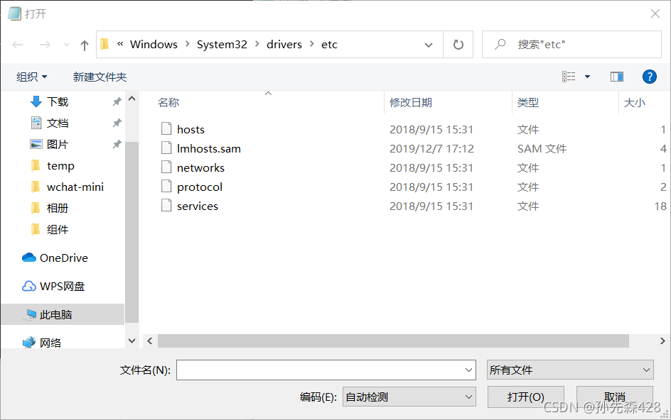 4.输入地址后会发现找不到hosts文件,需要将右下角选择为所有文件,这样就能看见了