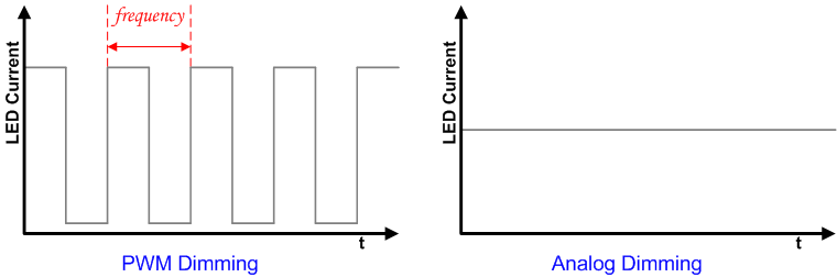 在PWM dimming状态下,LED亮度会有”亮“、”暗”两个状态,不同PWM duty下可以呈现出不同的亮度,当PWM dimming的频率过低的时候会出现频闪(Flicker)问题。采用analog dimming的话LED会恒亮,在dimming过程中IC只会改变输出电流值,LED亮度也会跟着改变,不会有频闪(Flicker)问题。