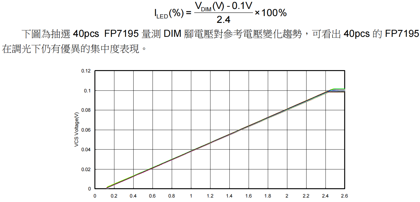 FP7195 同时也支援模拟调光(DC 调光),只要在 DIM 脚输入 0.1~2.5V,即可控制输出电流 0.1%~100%(参考电压 0.1mV~100mV)。DIM 脚电压(VDIM)与电流百分比(ILED(%))换算式如下: