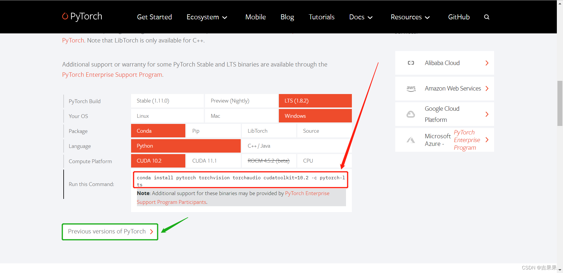另:若需要选择其他版本的PyTorch点击绿色框中的指令即可