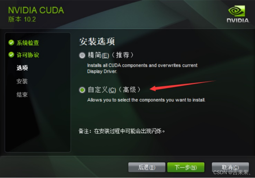下载完成后将CUDA安装,注意:建议默认路径,后期需要添加环境变量,安装时选择自定义安装: