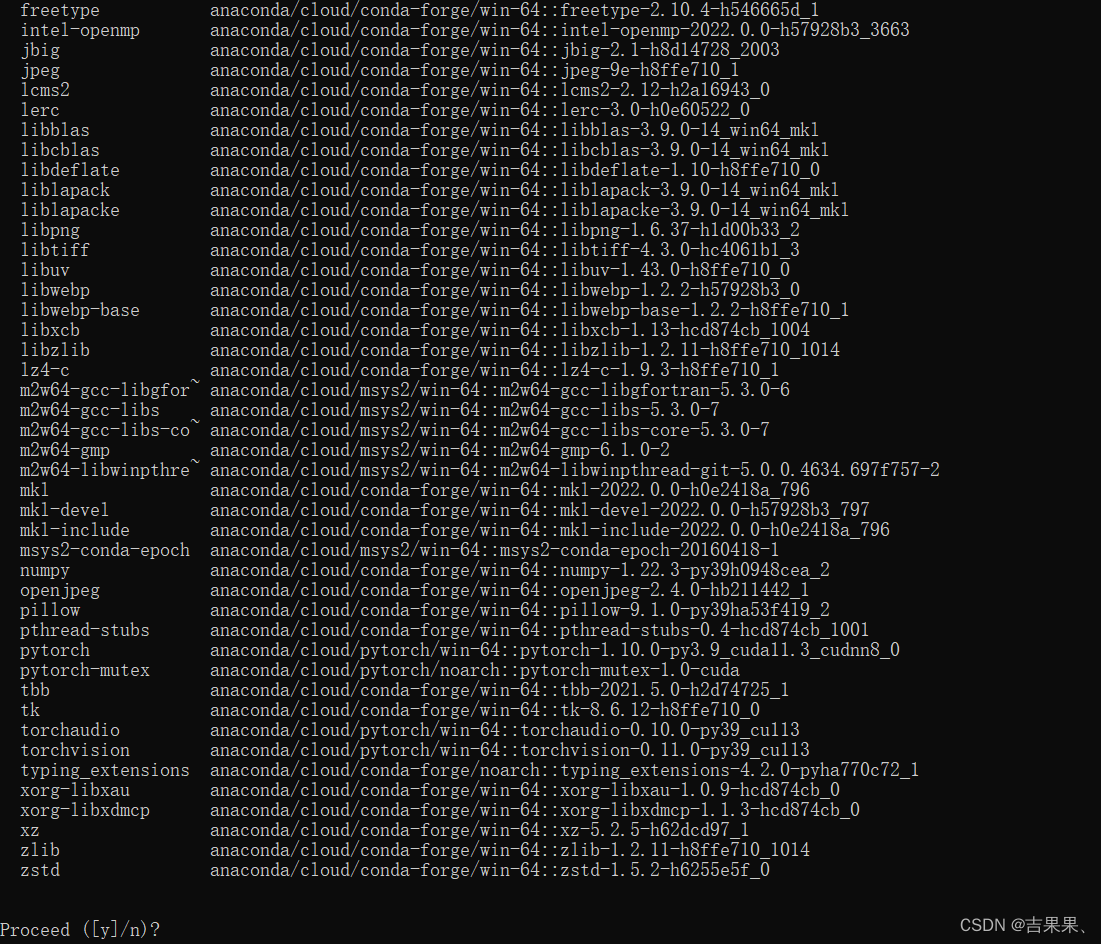 3、输入PyTorch安装指令指令后,查看conda找到将要安装的包是否是要进行安装的