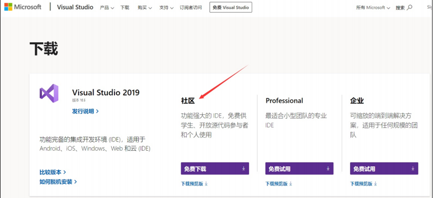 下载Visual Studio 社区版链接:https://visualstudio.microsoft.com/zh-hans/downloads/