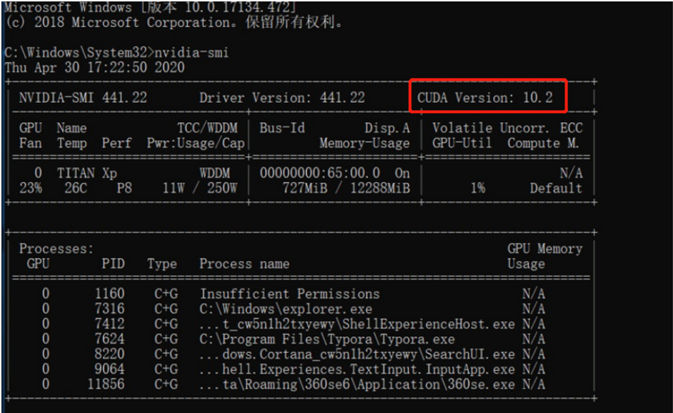 注意:右上角显示的CUDA版本(红色框中)是当前版本所支持的最高CUDA版本。