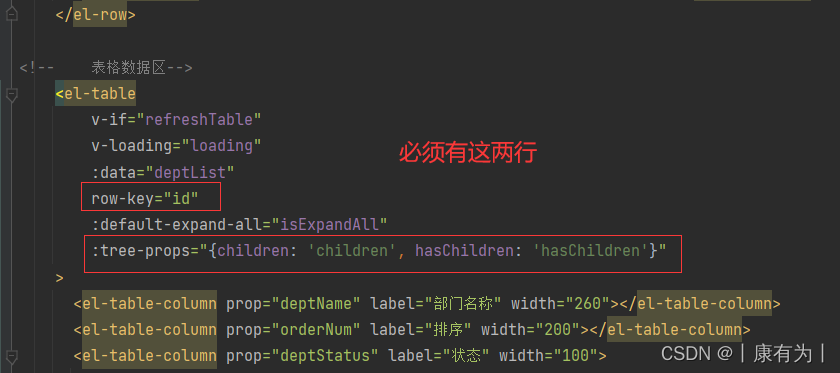 row-key="id"和:tree-props="{children: 'children', hasChildren: 'hasChildren'}是必须的。