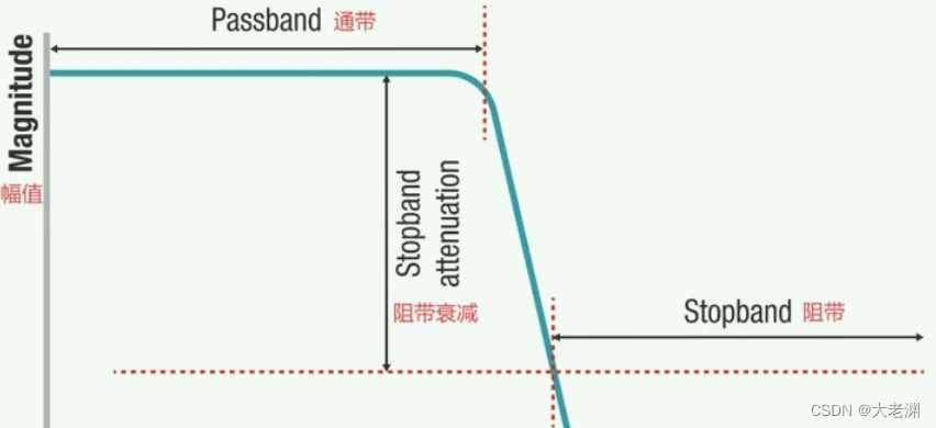 低通滤波器,Low Pass Filter,缩写LPF。它的特性是允许频率低于某一频率的信号通过,衰减高于此频率的信号。低频滤波器的截止频率fc对应以dB为单位的幅频特性曲线上-3dB的点对应的频率,-3dB = 20lg(0.707)(带宽是指被测信号幅值衰减到0.707倍时对应的频带宽度。幅度的平方即为功率,平方后为0.5倍,带宽也即功率衰减到一半时的频带宽度)。当信号频率 < 截止频率时,信号几乎无损通过;当信号频率 > 截止频率时,信号开始衰减,且越远离截止频率衰减越大。它的幅频特性曲线如下图所示。