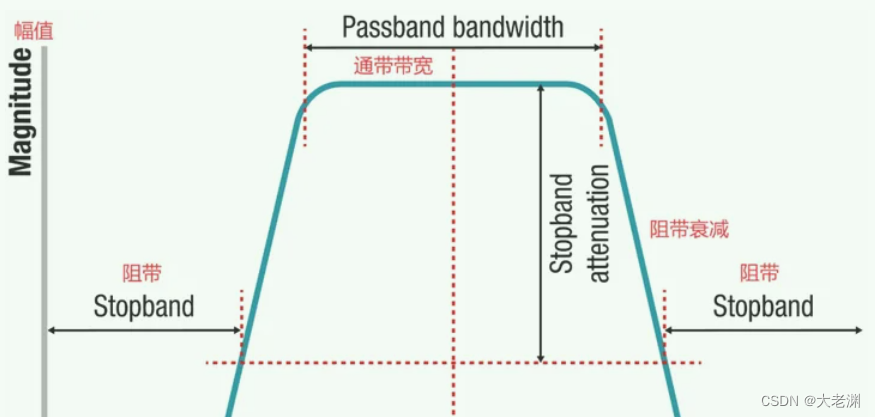 带通滤波器,Band Pass Filter,缩写BPF。它的特性是允许某一频段的信号通过。带通滤波器有两个截止频率,分别是低频截止频率fc1与高频截止频率fc2,带通滤波器仅允许fc1 ~ fc2这个频率段的信号通过。它的幅频特性曲线如下图所示。