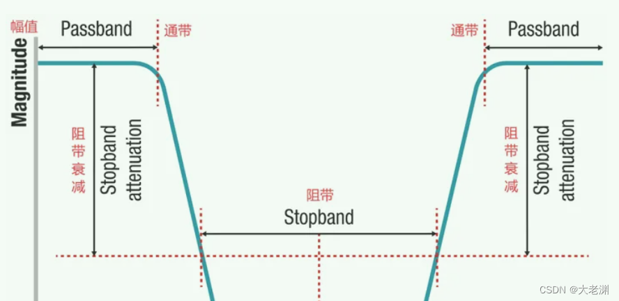 带阻滤波器,Band Stop Filter,缩写BSF,又称陷波器(Notch Filter)。它的特性是不允许某一频段的信号通过。带阻滤波器有两个截止频率,分别是低频截止频率fc1与高频截止频率fc2,带阻滤波器仅不允许fc1 ~ fc2这个频率段的信号通过。 注意,上图约1MHz以后的波形也衰减了,这是因为所用的运放的带宽被设置为10MHz,它无法处理太高频率的信号。它的幅频特性曲线如下图所示。