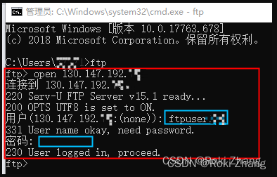 【用户名 → 回车 → 密码 → 回车】,出现【User logged in,proceed】代表成功