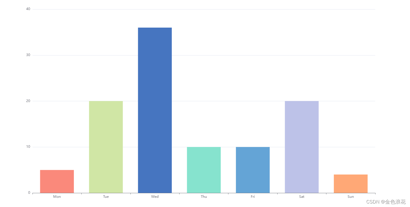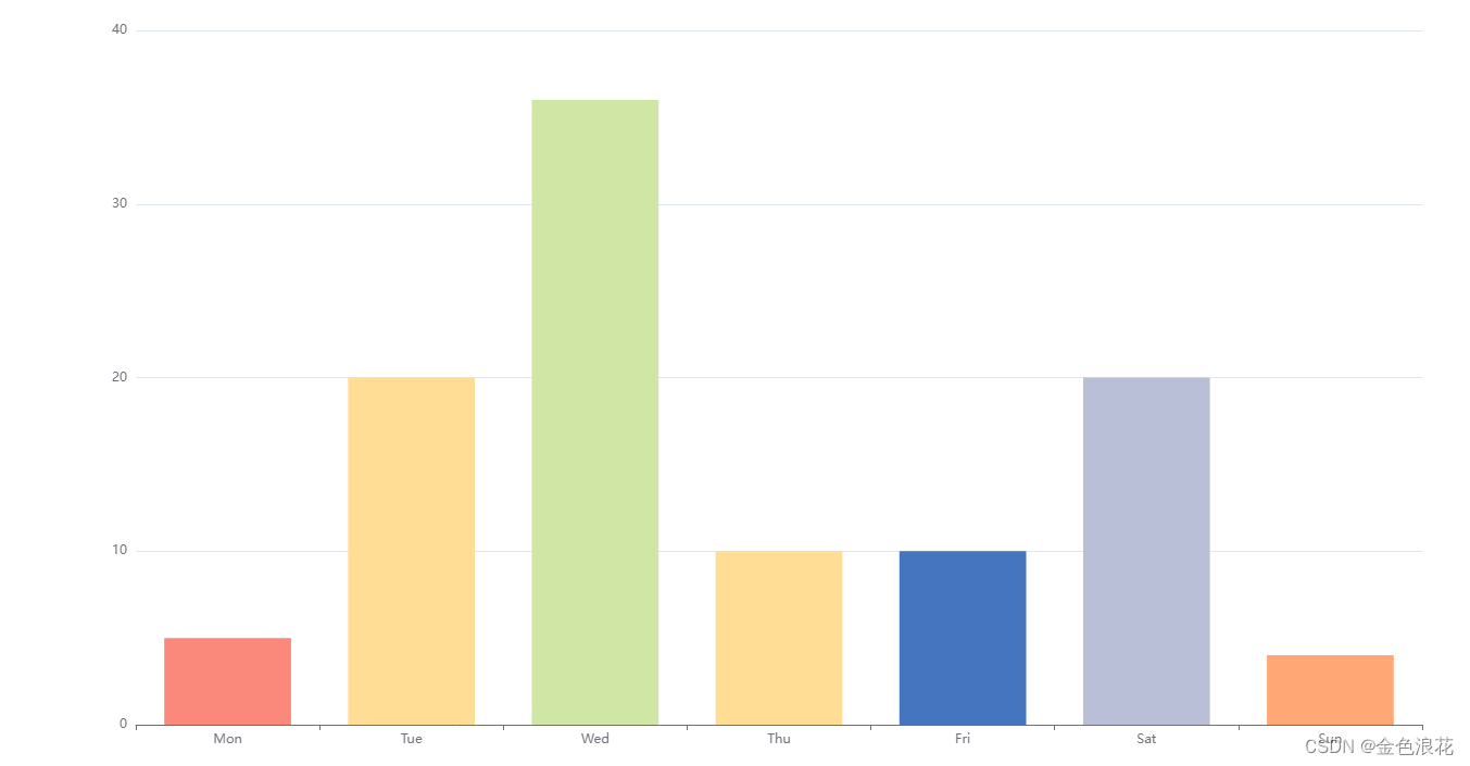 echarts柱状图,默认所有柱子都是同一个颜色,显示效果差强人意,本文介绍如果修改成为每个柱子添加不同的颜色,以及如何添加渐变色,丰富图表的显示鲜果。先看效果: