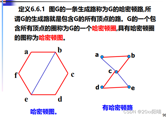 定义:含有哈密顿圈的图称为哈密顿图。补充:哈密顿路即包含所有顶点且不重复的路。(两个对顶三角含有哈密顿路,但不是哈密顿图因为没有哈密顿圈)