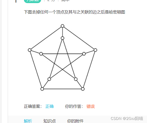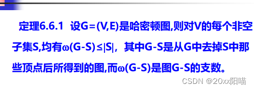 2.(判断是哈密顿图的必要条件)该图去掉s个顶点之后的分支数一定小于等于去掉的顶点数s,若不满足一定不是哈密顿图。