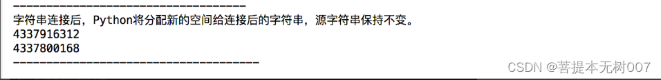 print('字符串连接后,Python将分配新的空间给连接后的字符串,源字符串保持不变。')