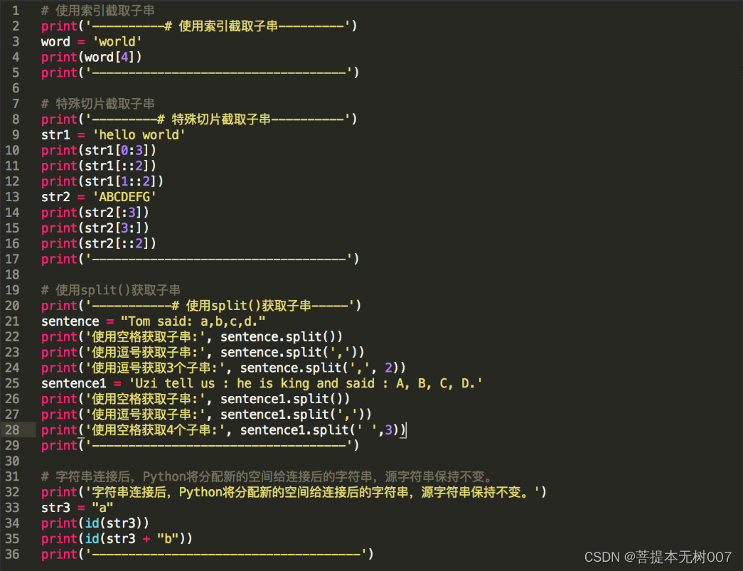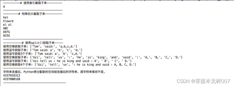 字符串的截取是实际应用中经常使用的技术,被截取的部分称为“子串”。Java中使用函数substr()获取子串,C#使用函数substring()获取子串。而Python由于内置了序列,可以通过前面介绍的索引、切片获取子串,也可以使用函数split()来获取。字符串也属于序列。