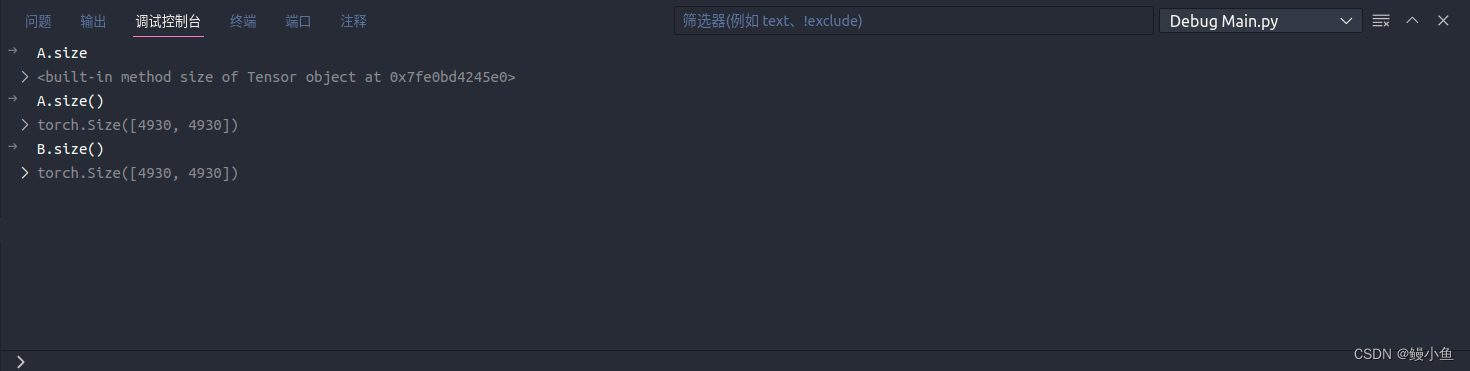 在调试控制台输入A.size()和B.size(),这个时候的结果都是[4930, 4930] ,也就是满足运行预设的条件,那为什么会出错呢?也就是这里运算是不会出错的,那问题就出在输入矩阵了,输入矩阵的选择我们再看一眼,这个时候我们发现,我们如果这样操作的话,第二个循环进行采样的时候z1已经变了,也就是我们不再是在原来的z1和z2(z, z1, z2 = encoder_model(data.x, edge_index, edge_weight))上进行取值了,所以会出问题那就改一下