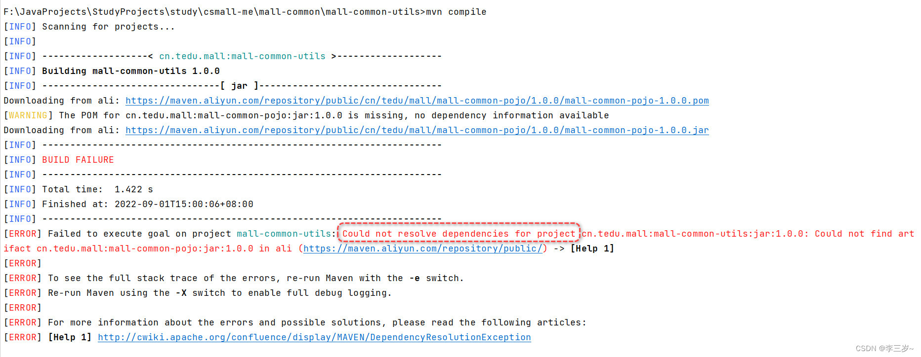 这个错误提示只是告诉了我们 无法解析项目的依赖关系 。