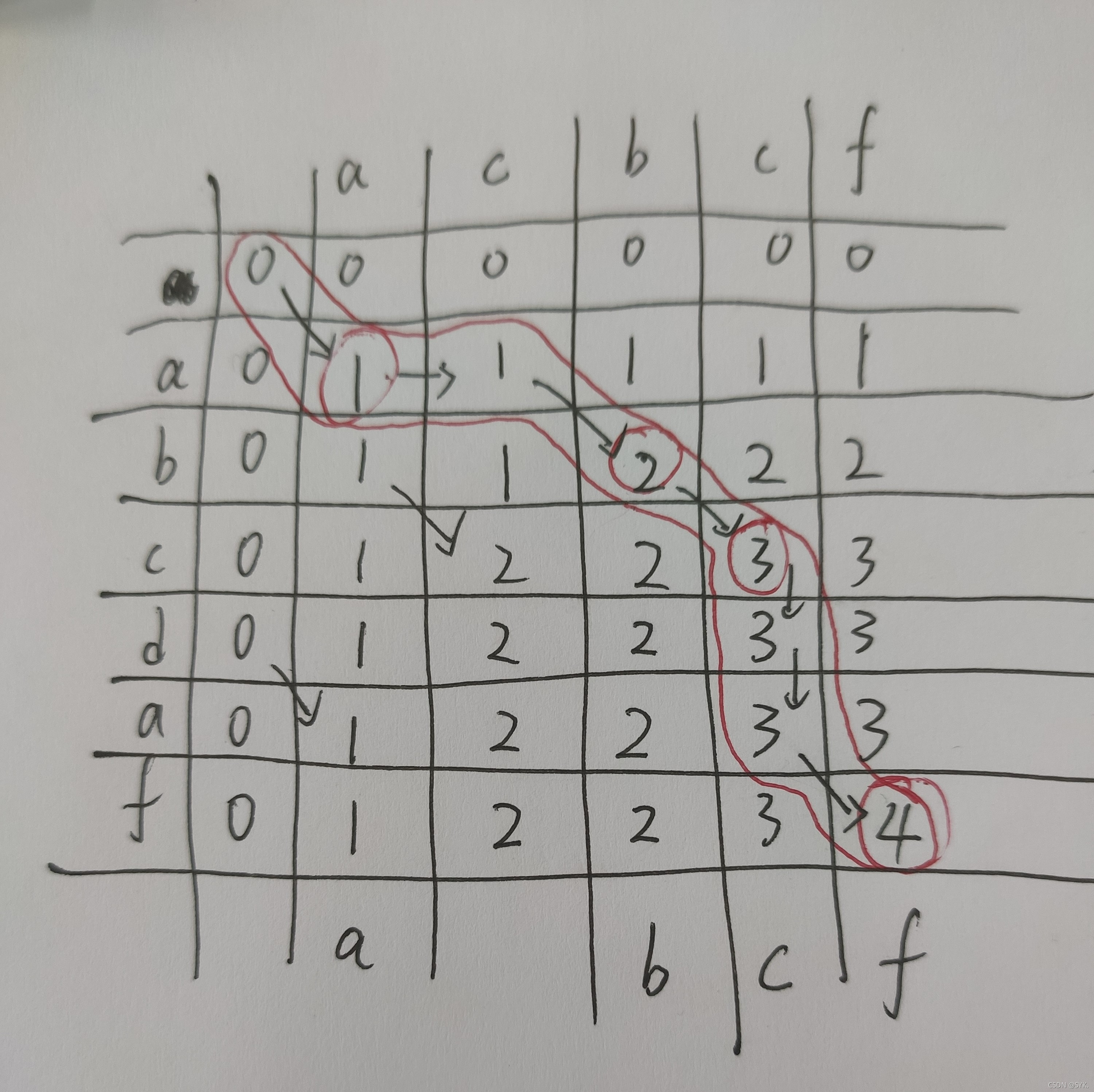 结果为 abcf 即我们所求的 acbcf 和 abcdaf 的最长公共子序列