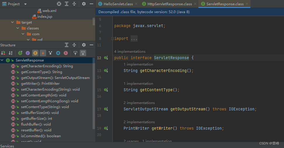 我们点击Structure,我们可以看到该类的方法。同时我们可以看到该类继承ServletResponse,我们可以进入源码,查看方法: