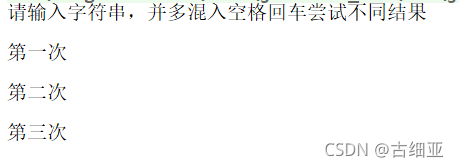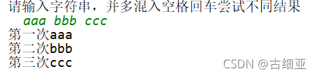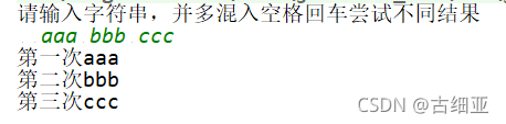 System.out.println("请输入字符串,并多混入空格回车尝试不同结果");