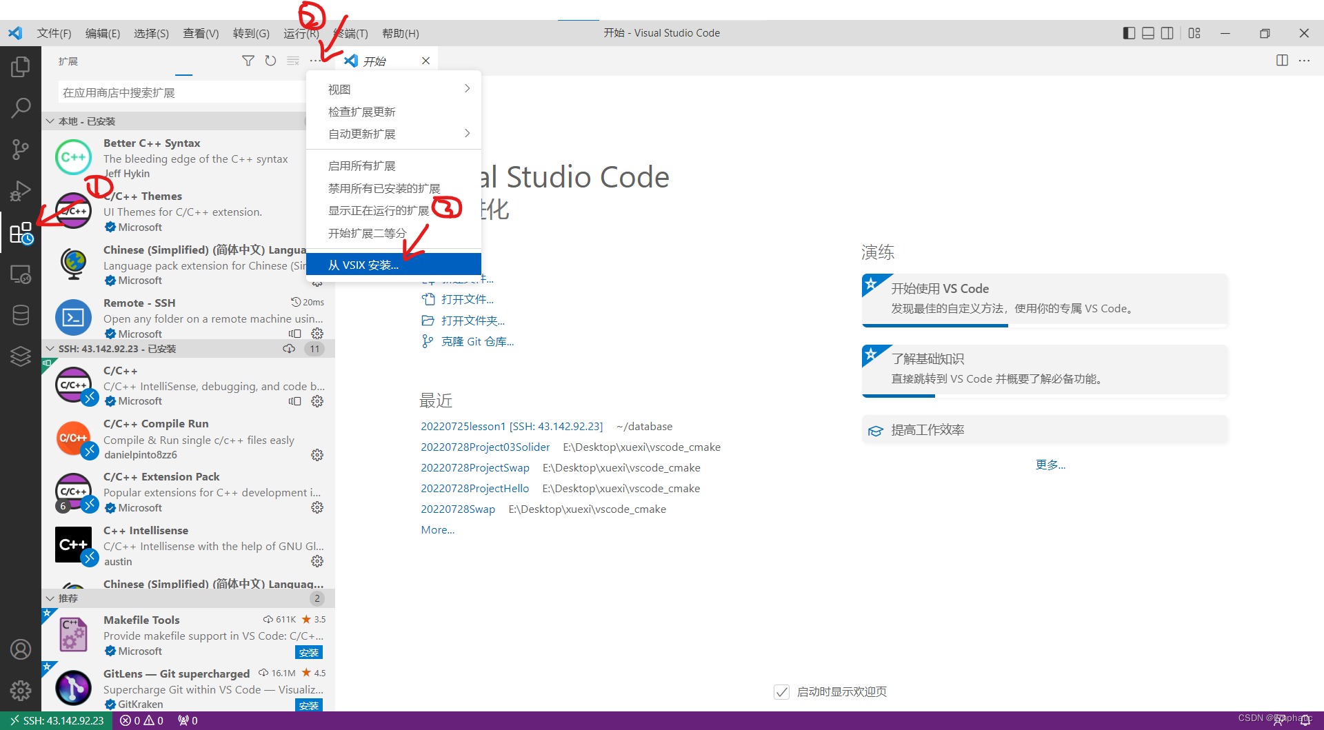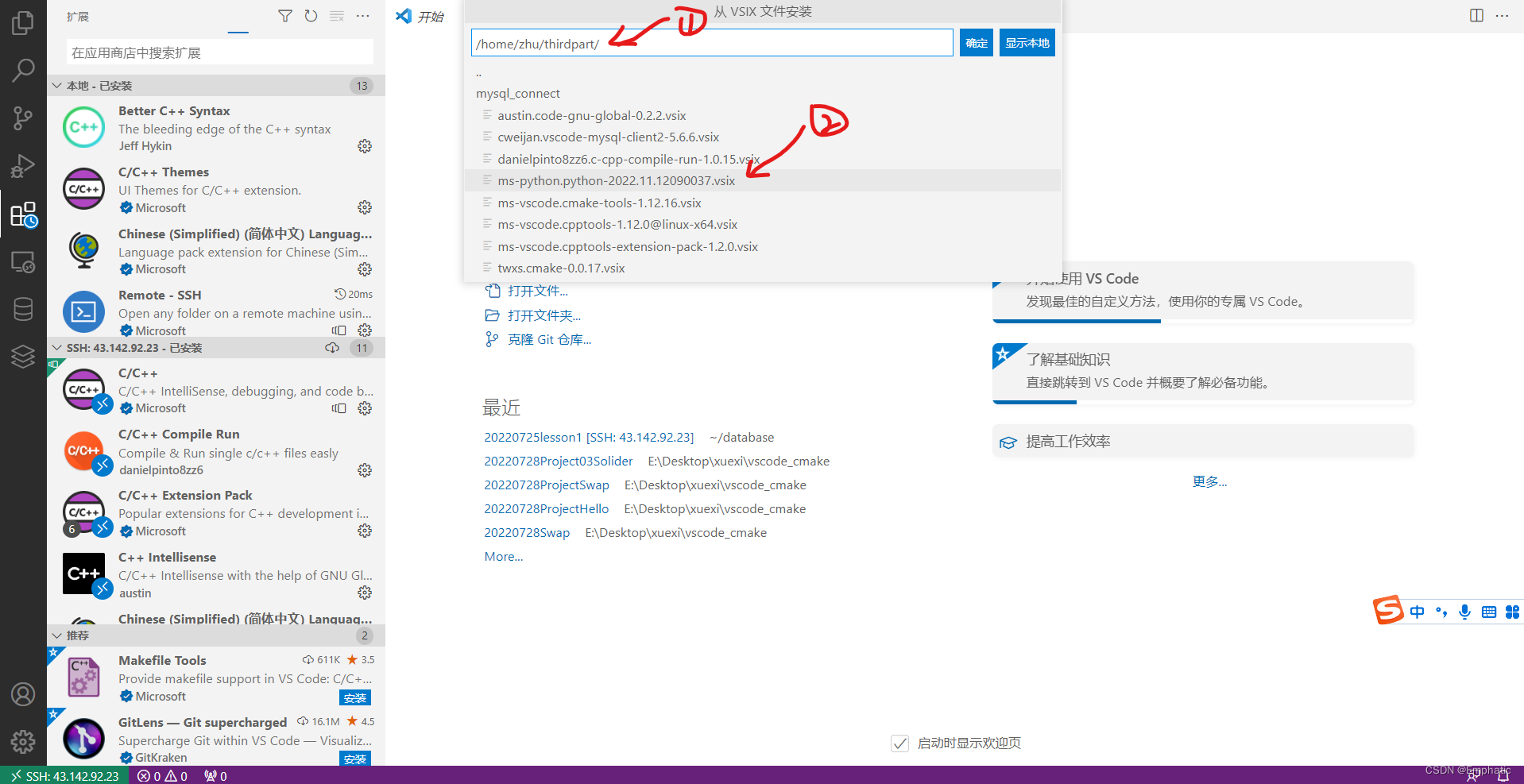 - 在vscode中,链接远端服务器,选择VSIX安装插件;