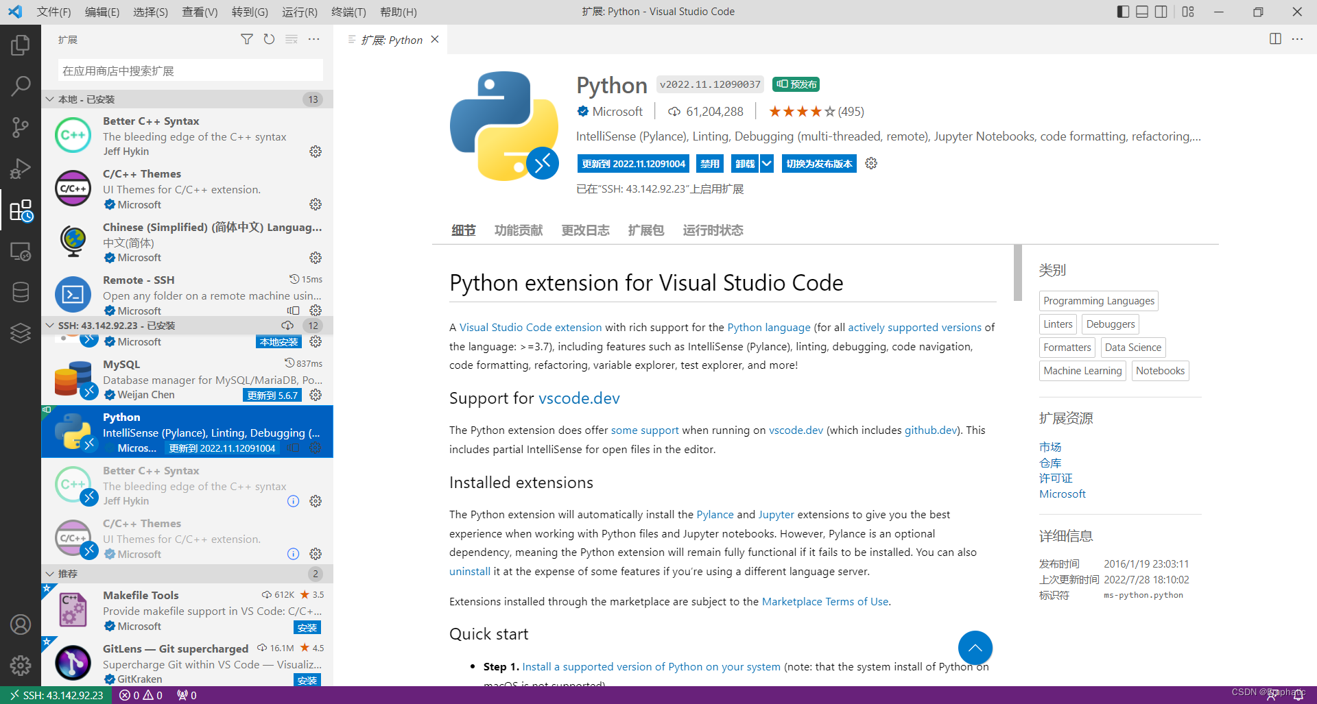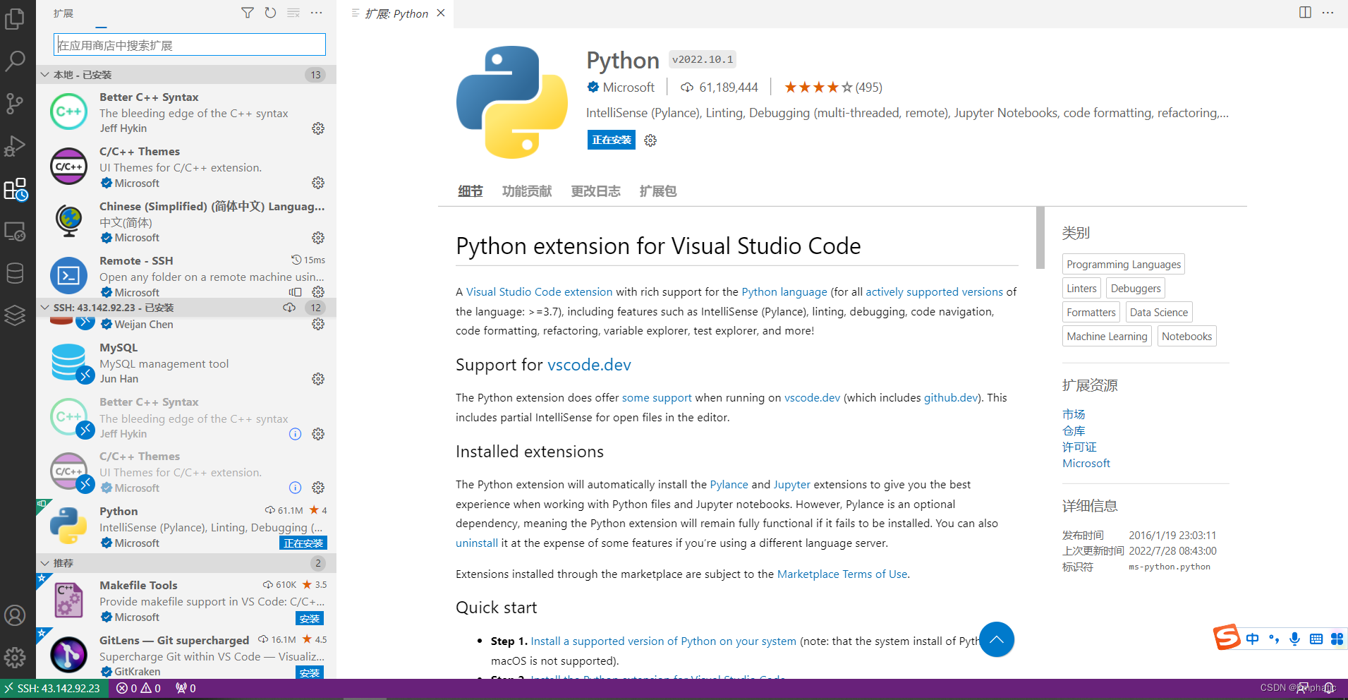 但是会遇到本地安装插件很方便,远程服务器上插件安装不上或者速度很慢的问题,比如我想在远程服务器上安装Python插件,一直显示正在安装,安装不上。