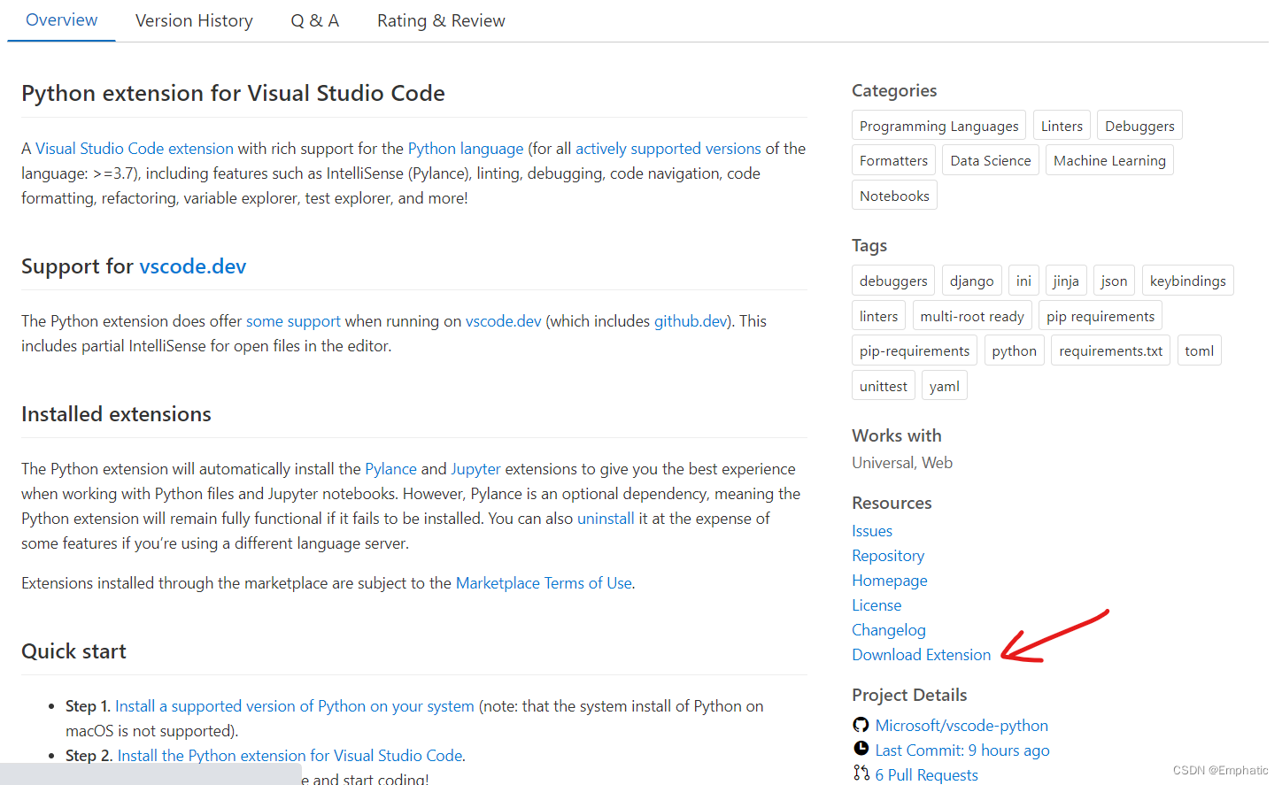 点进去Python,下拉找到download extension选项,下载该插件文件