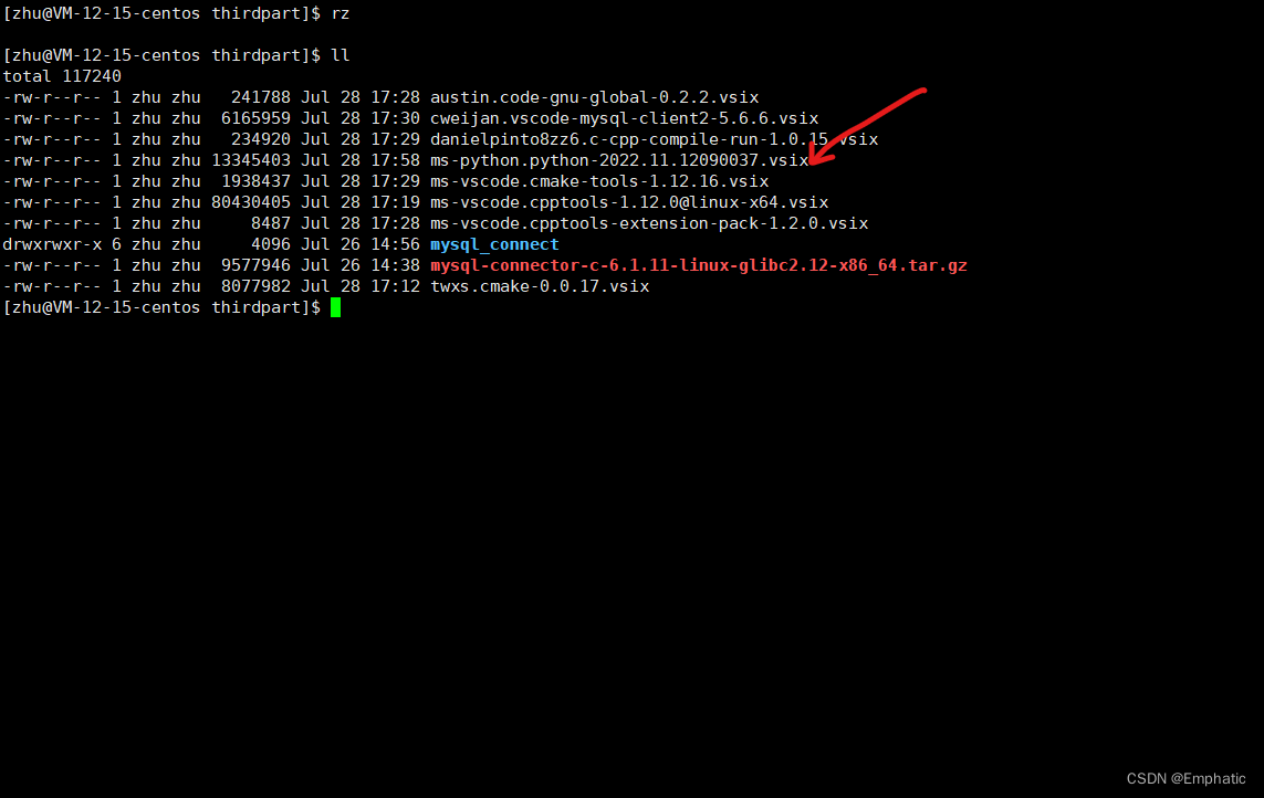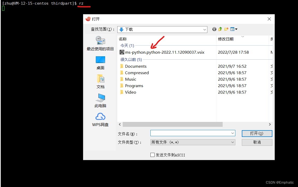 比如在我的云服务器上,选定一个文件夹thirdpart,执行rz命令,选中python插件文件并打开