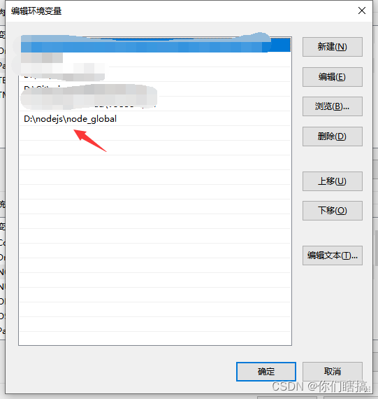 在用户变量的【Path】中,点击编辑,将之前的默认npm安装包路径修改为之前新建的文件夹【node_global】路径,点击确定。
