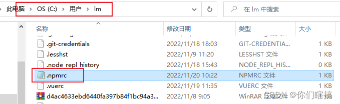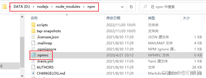 接着找到C\Users\用户名下面的【.npmrc】文件,以及node安装文件夹下D:\nodejs\node_modules\npm的【.npmrc】文件,注意不是【npmrc】文件!!!!!!,这两个文件图标不一样,文件类型不一样!!!!!