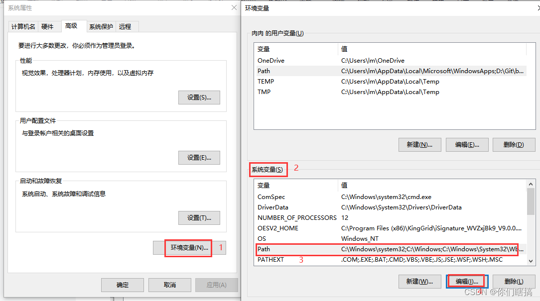 在新弹出窗口点击【环境变量】,找到系统变量中的【Path】,点击编辑,