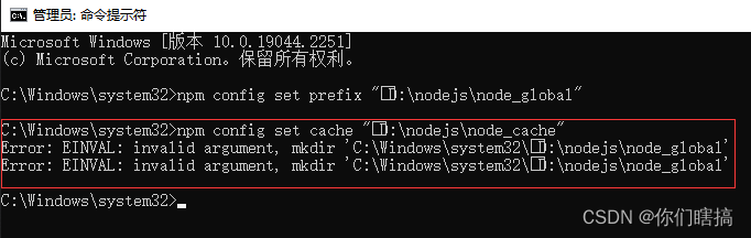 1.Error: EINVAL: invalid argument, mkdir 'C:\Users\lm\D:\nodejs\node_global' 怎么解决?