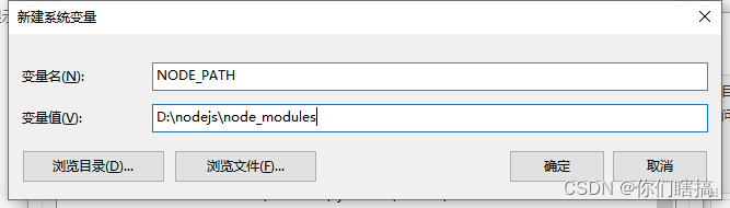 设置变量名为【NODE_PATH】,变量值为安装node时自带的node_modules文件夹的路径,点击确定,