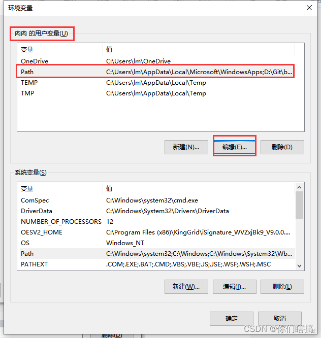 在用户变量中同样也点击【Path】,然后点击编辑,