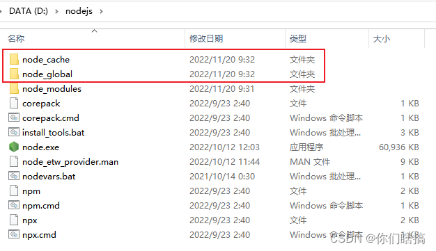 6.修改默认环境配置,主要是修改默认的node缓存路径和npm全局安装路径,打开之前安装node的文件夹,直接新建两个新的文件夹【node_cache】,【node_global】分别用于存放node缓存和npm全局安装包。因为你们看了其他博主的文章,说在环境变量中配置路径【D:\Develop\nodejs\node_global\node_modules】,但是他又没说在node_global下面新建node_modules文件夹,我在这里郑重声明!!!!不用在新建的【node_global】文件夹下面新建【node_modules】文件夹,环境配置也不是那样配的。