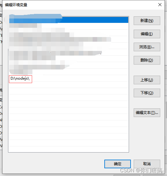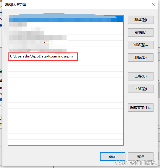 可以看到在最后一行中也新增了一串东西(这个路径就是后面npm install安装全局包,比如vue,vue脚手架,cnpm等存放的位置,很明显我们不希望放在C盘,我们要放在D盘),这就是给你们看一看而已,确保到这步还都是顺利的,