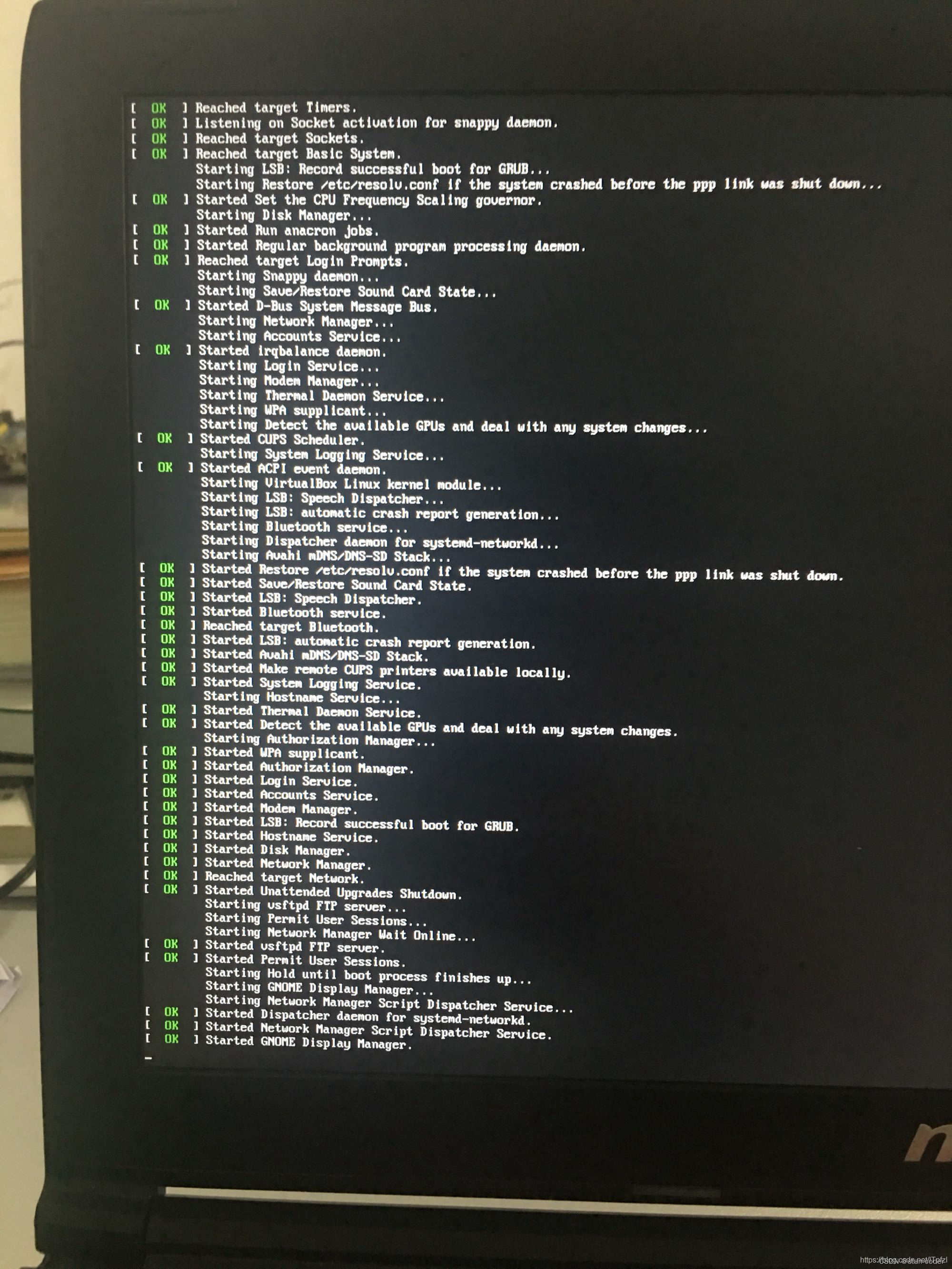 3、当再次开始刷屏这些信息的时候,立马键盘狂点 “Ctrl + Alt +F2”,一定要非常快速的点,直到出现用户登陆终端!但是刚出现用户登陆的时候,别急着输入,因为这时候后台的信息还在刷屏,你可以看到刷屏信息的残影,稍等片刻,直到用户登陆终端稳定下来,你再输入你的用户和密码,进入命令终端系统