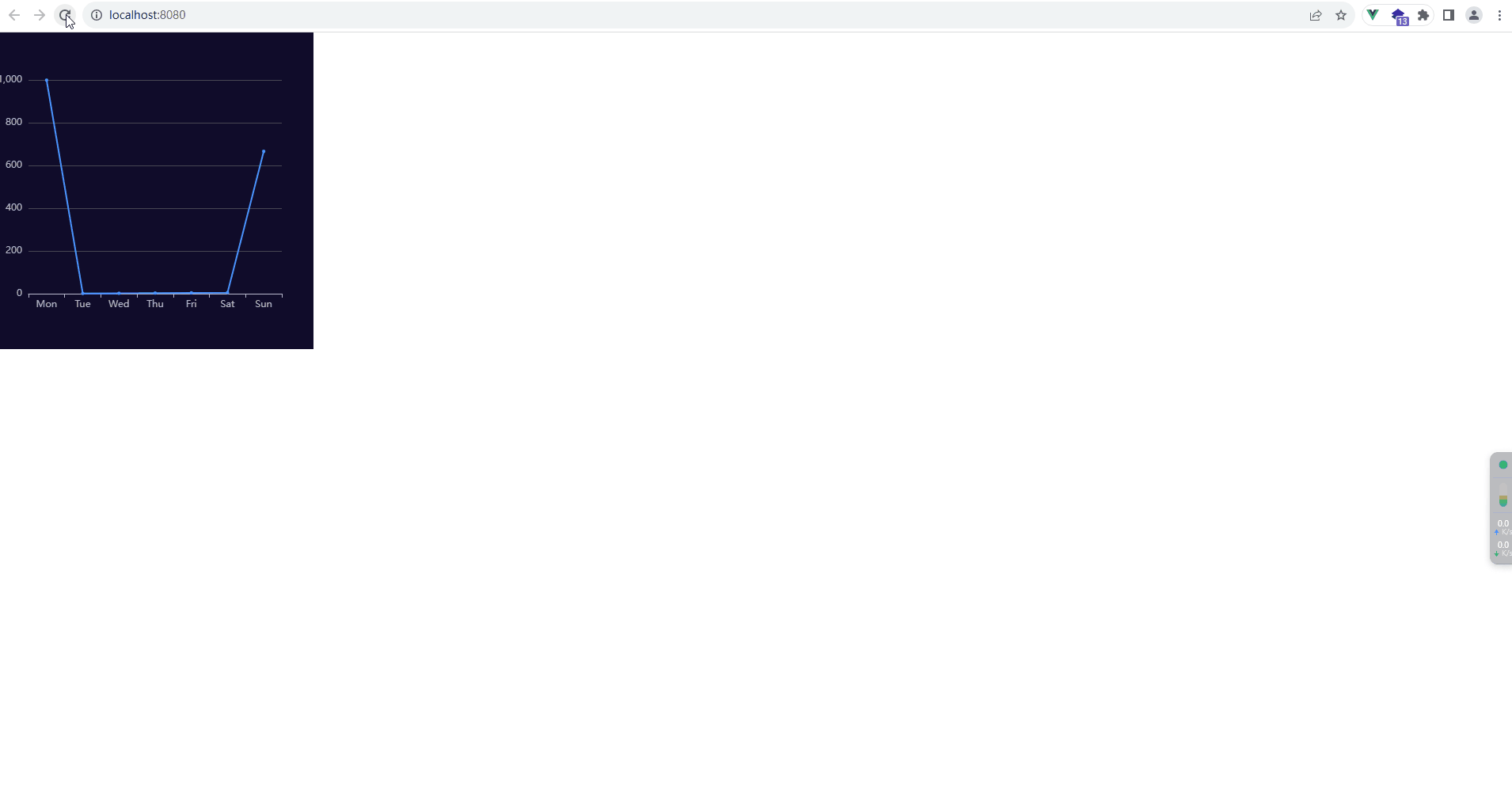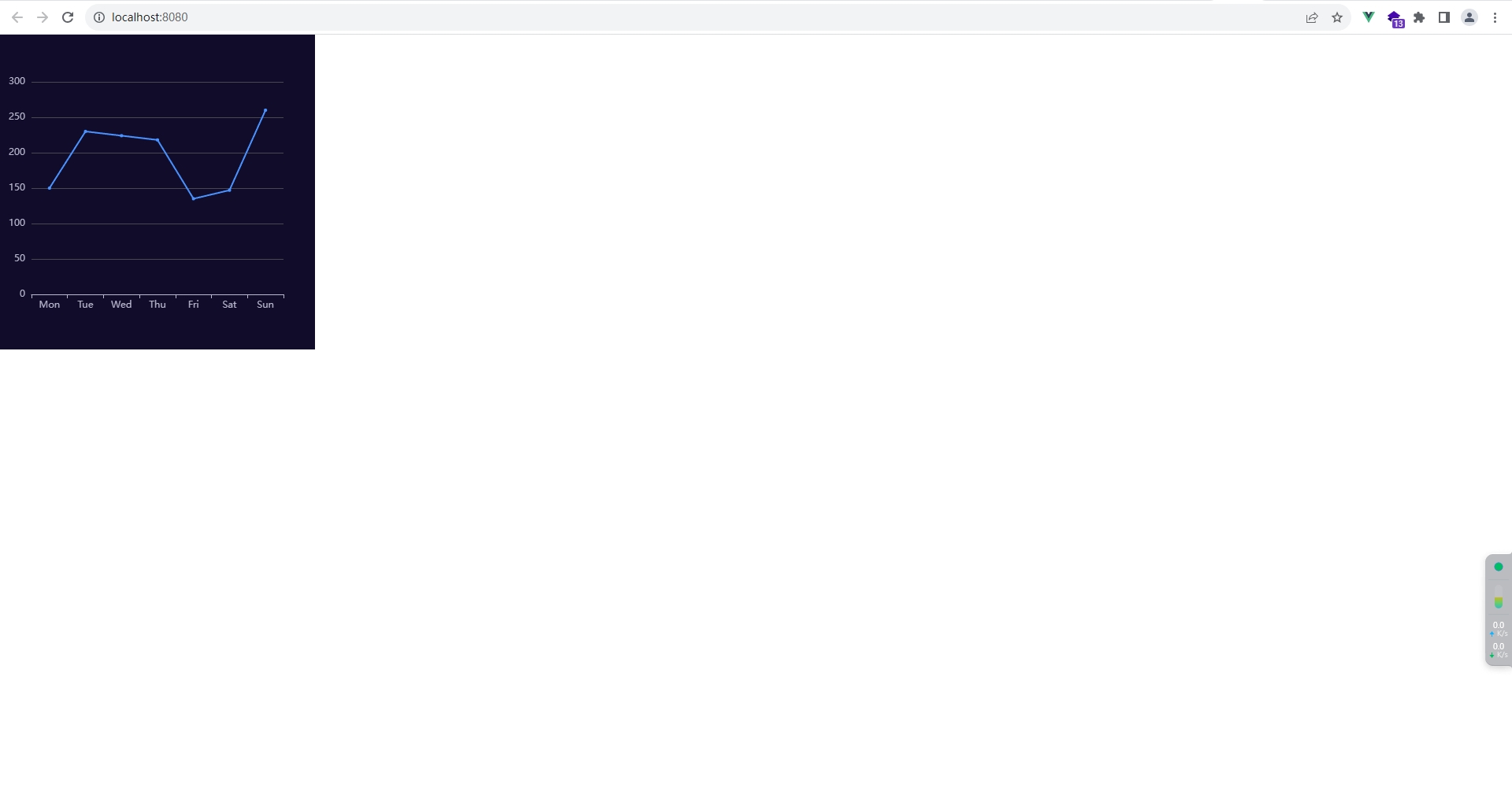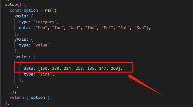 :const option = ref({ xAxis: { type: "category", data: ["Mon", "Tue", "Wed", "Thu", "Fri", "Sat", "Sun"], }, yAxis: { type: "value", }, series: [ { data: [null, null, null, null, null, null, null], type: "line", }, ], });
