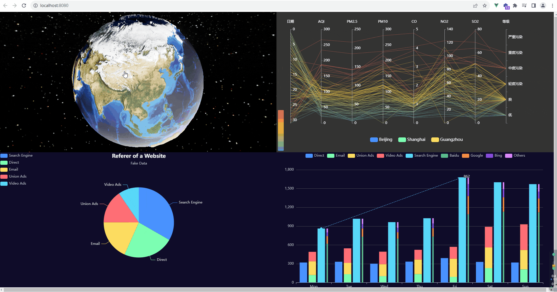 地图图表除外(可能需要花费一部分时间去了解复杂的配置项才可以实现),其实大部分图表呢,都是可以按照上面的配置步骤去实现的,这里我就从官方示例中挑选了几个比较炫酷的图表一起实现到了单个页面中,如下图:
