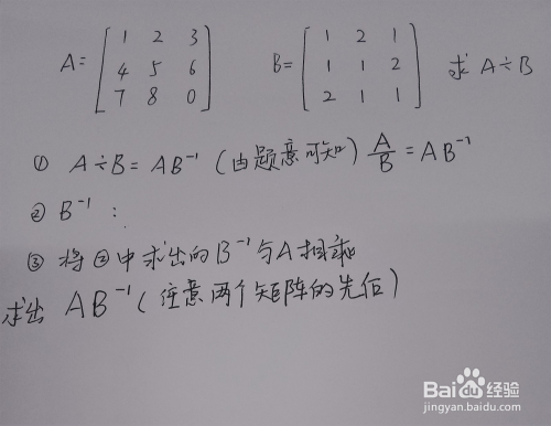 对于矩阵的除法,我们一般不说矩阵的除法,通常都是讲的矩阵求逆 具体操作: 我们先将被除的矩阵转化为它的逆矩阵 之后再与另一个矩阵进行矩阵的乘法运算 下面举个例子: A=1 2 3 B=1 2 1 4 5 6 1 1 2 7 8 0 2 1 1 求A/B(也就是说AB^-1)按照步骤进行